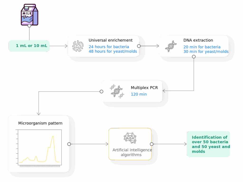 Avoid spoilage of products by detecting and identifying over 80 bacteria in less than 28 hours and over 50 yeast and molds in less than 52 hours. It’s simple!, you only need one thermoblock, one qPCR cycler and one laptop to turn your traditional laboratory into an advanced molecular microbiology laboratory.